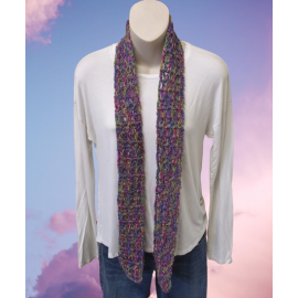 Grab this lightweight multicolored shawl anytime you need a little extra warmth in the spring or summer, or when you need a pop of color for your fall or winter outfit. Crocheted in an open mesh stitch in soft multicolored acrylic yarn, it's your perect go to when you need that little extra something. It's wearable in so many ways! You can throw it around your shoulders to fancy up a little summer dress or a add a casual textured accessory to a plain top by wearing it in front or off to the side. Features rich colors in teal, pink, gold, green, purple and more, and has a pretty granny square edging.